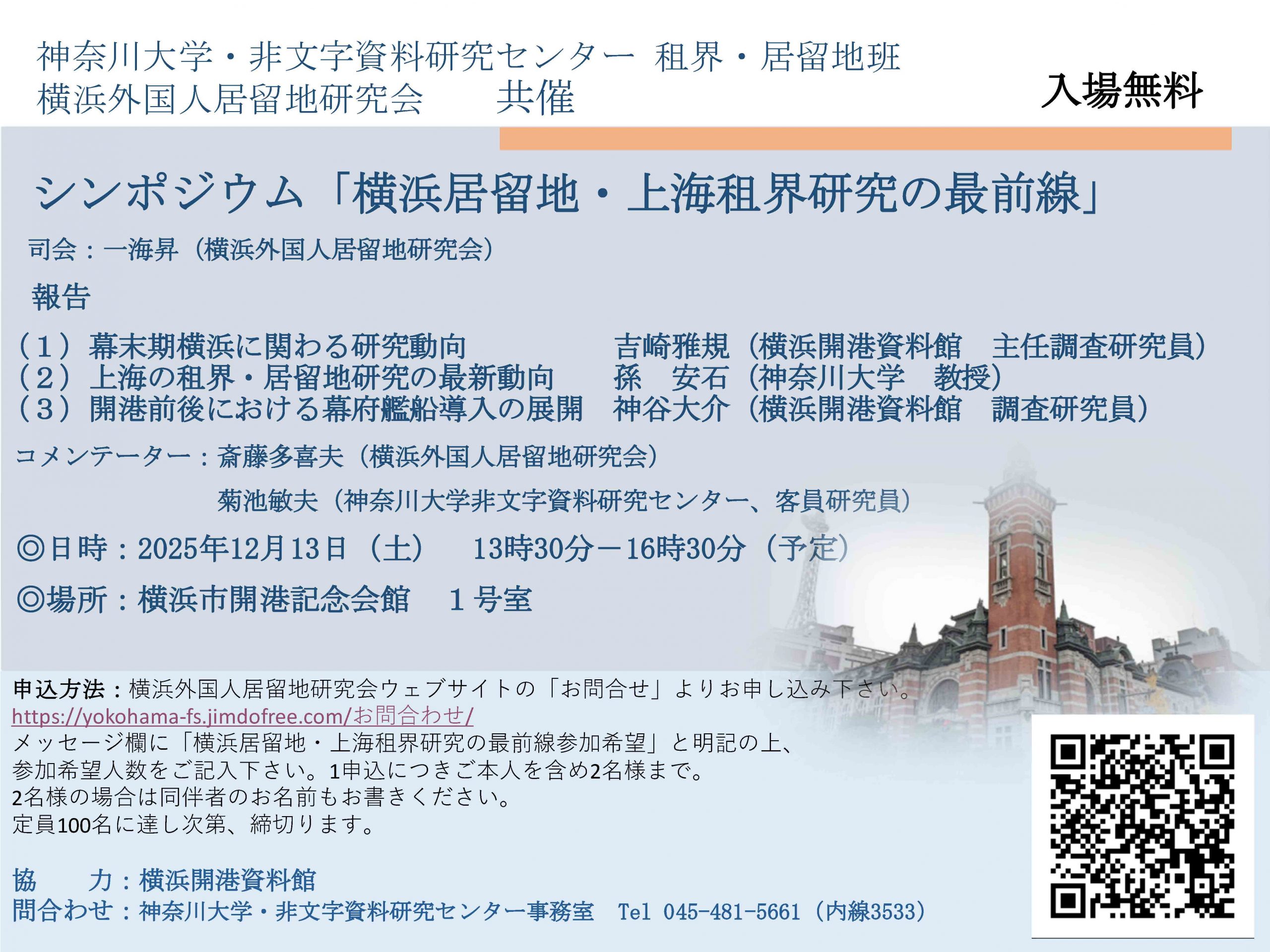 The symposium below was held on December 13, jointly organized by the Research on the Development of Cities and Architecture in the Open Ports (International Settlements and Foreign Concessions) of East Asia at the Research Center for Nonwritten Cultural Materials and the Yokohama Foreign Settlement Research Society.